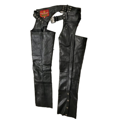 Experience the difference of Eagle Leather's Men's Rally Chaps. Crafted from 1.1 - 1.2 mm milled cowhide, these chaps offer both comfort and durability. With a size-adjusting lace, high-quality lining, and corrosion-resistant hardware, you'll have everything you need for your journey. And with a 2-year warranty, your investment is secure. Features: Milled 1.1 - 1.2 mm cowhide for durability Two jean style front pockets for convenience Zipper buffer to prevent liner from catching in the zippers Four snaps at the bottom for easy wear Size adjusting lace on the back for a perfect fit High-quality, heavy-duty mesh lining for comfort Non-rusting and non-corroding hardware for longevity 2-Year Eagle Leather Warranty Feature and Importance: Milled Cowhide: Milled 1.1 - 1.2 mm cowhide ensures durability and long-lasting use. Front Pockets: Two jean style front pockets provide convenient storage. Zipper Buffer: A zipper buffer prevents the liner from catching in the zippers, enhancing usability. Adjustable Size: The size adjusting lace on the back allows for a perfect, personalized fit. High-Quality Lining: A heavy-duty, high-quality mesh lining offers enhanced comfort. Durable Hardware: All hardware is non-rusting and non-corroding, promising longevity and reliability. 2-Year Warranty: Comes with a 2-year Eagle Leather warranty for peace of mind. Size Chart CHAP SIZE WAIST THIGH INSEAM 3X-Small 25" to 33" 20" 32.25" 2X-Small 27" to 35" 21" 32.5" X-Small 29" to 37" 22" 32.75" Small 31" to 39" 23" 33" Medium 33" to 41" 24" 33.25" Large 35" to 43 25" 33.5" X-Large 37" to 45" 26" 33.75" 2X-Large 39" to 47" 27" 34" 3X-Large 41" to 49" 28" 34.25" 4X-Large 43" to 51" 29" 34.5" 5X-Large 45" to 53" 30" 34.75" 6X-Large 47" to 55" 31" 35" 7X-Large 49" to 57" 32" 35.25" 8X-Large 51" to 59" 33" 35.5" 9X-Large 53" to 61" 34" 35.75" 10X-Large 55" to 63" 35" 36"