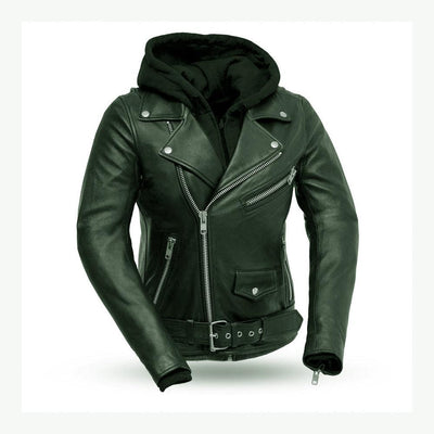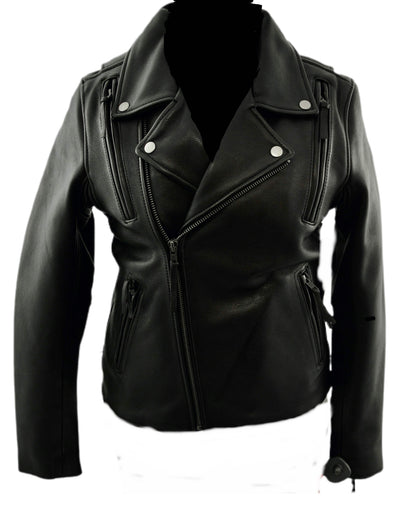 Everyone loves a classic style motorcycle jacket! Channel your inner James Dean with this heavier weight jacket. Lots of pockets, including conceal carry pockets and armor pockets for CE rated armor. The action back, removable belt, and insulated zip-out thermal liner will keep you comfortable on your ride. Features: 1.1-1.2mm Drum Dye Naked Black Cowhide Size down for best fit Motorcycle style with snap down lapel collar and asymmetrical zipper One zippered chest pocket Two zippered slash pockets with leather lining One patch pocket Two conceal carry pockets with bullet snaps and tapered holsters Removable belt Zippered sleeves with gussets Underarm grommets Action back Insulated zip-out thermal liner YKK zippers Armor pockets for CE rated armor