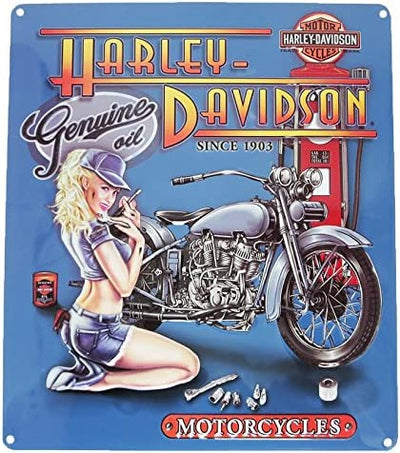 Harley-Davidson Embossed Mechanic Babe Tin Sign, 2011261. Features an embossed mechanic babe graphic. Convenient holes for hanging. Size: 13" x 15". Perfect for garage, shop, game room, bar, or living room, and makes great gift for your Harley enthusiast friends.