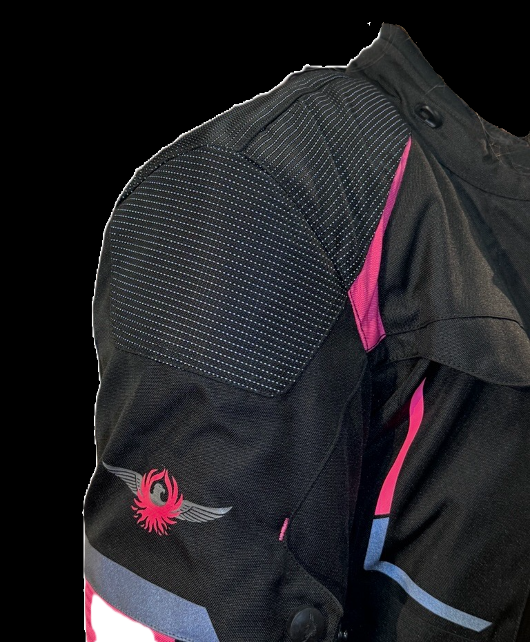 The Anacortes Touring Jacket brings together CE-rated protection, real touring features, and a women’s-specific fit in a black textile chassis with pink accents that looks sharp on any bike.