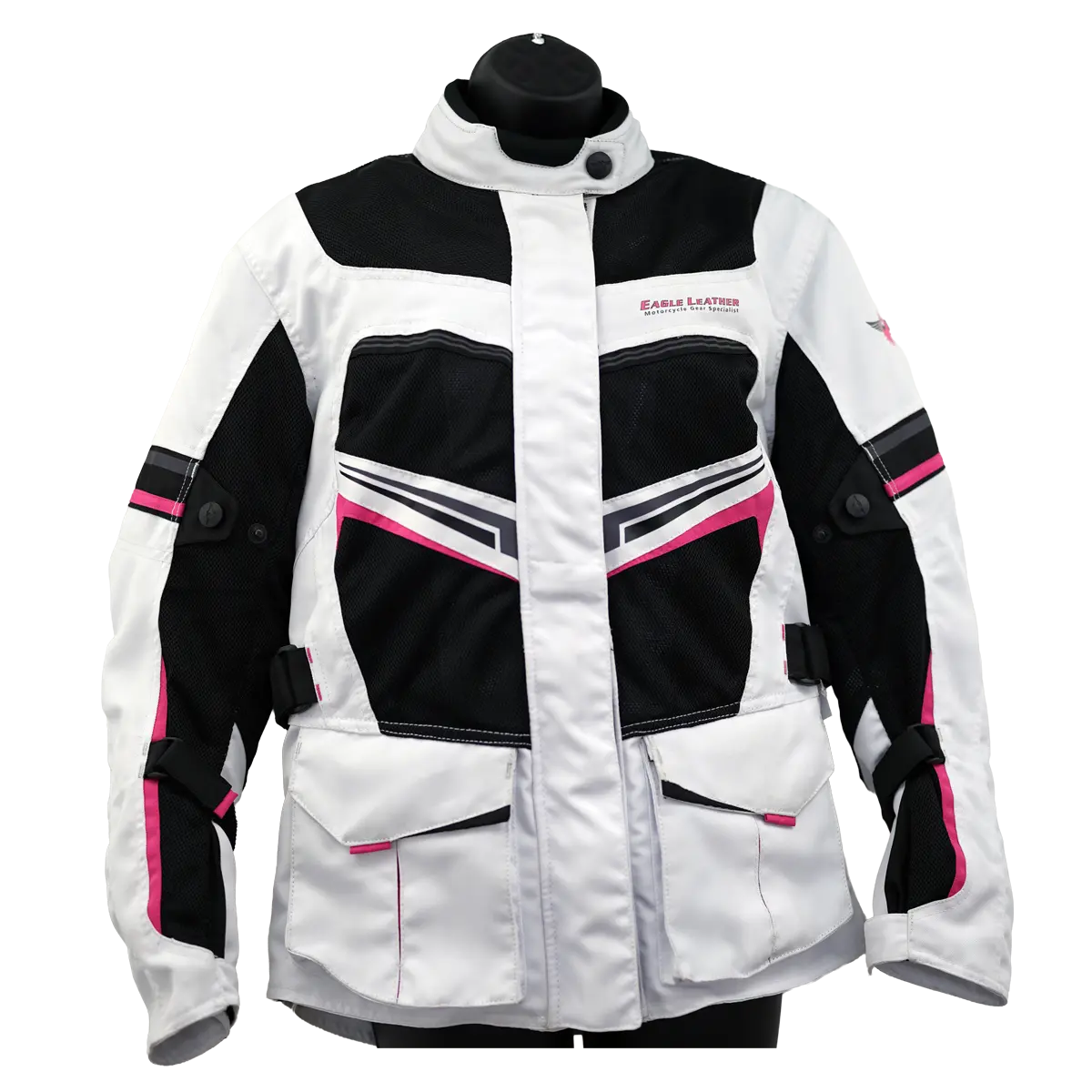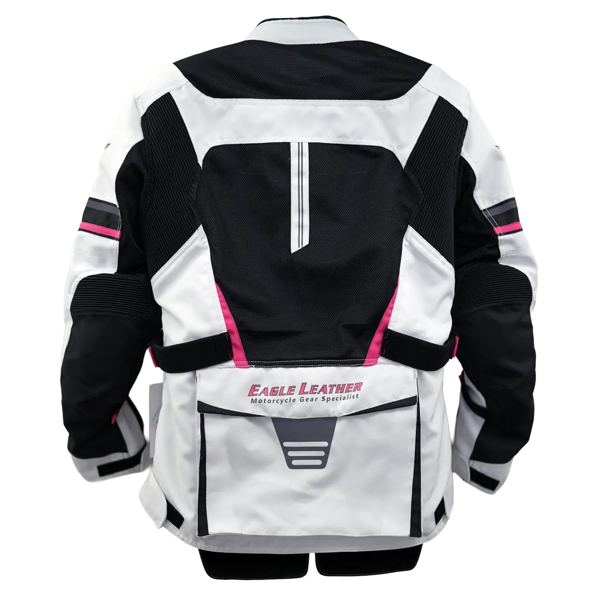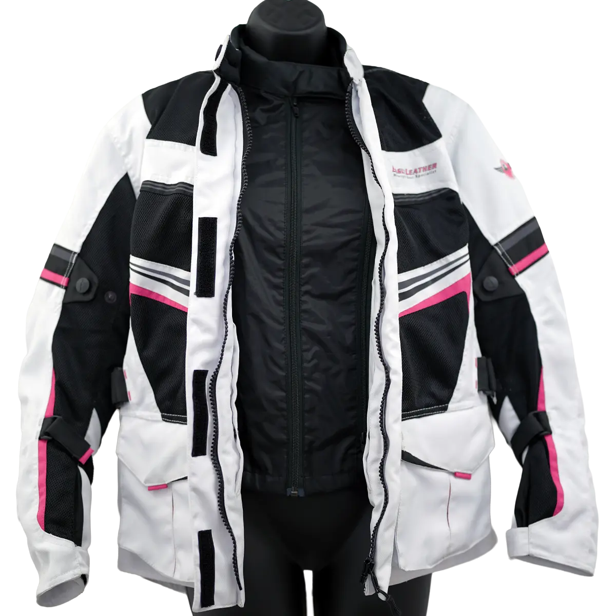 A removable standalone thermal liner jacket lets you warm things up for early-morning or late-season rides, then zip it out when the day heats up. Large chest and back vent panels work with the mesh zones to keep air moving, and big waterproof cargo pockets carry your small essentials. An adjustable neck slider and waist straps fine-tune the fit, and dual conceal-carry pockets add secure storage—all in a sharp white-and-black women’s cut with pink accents that pop without being loud.